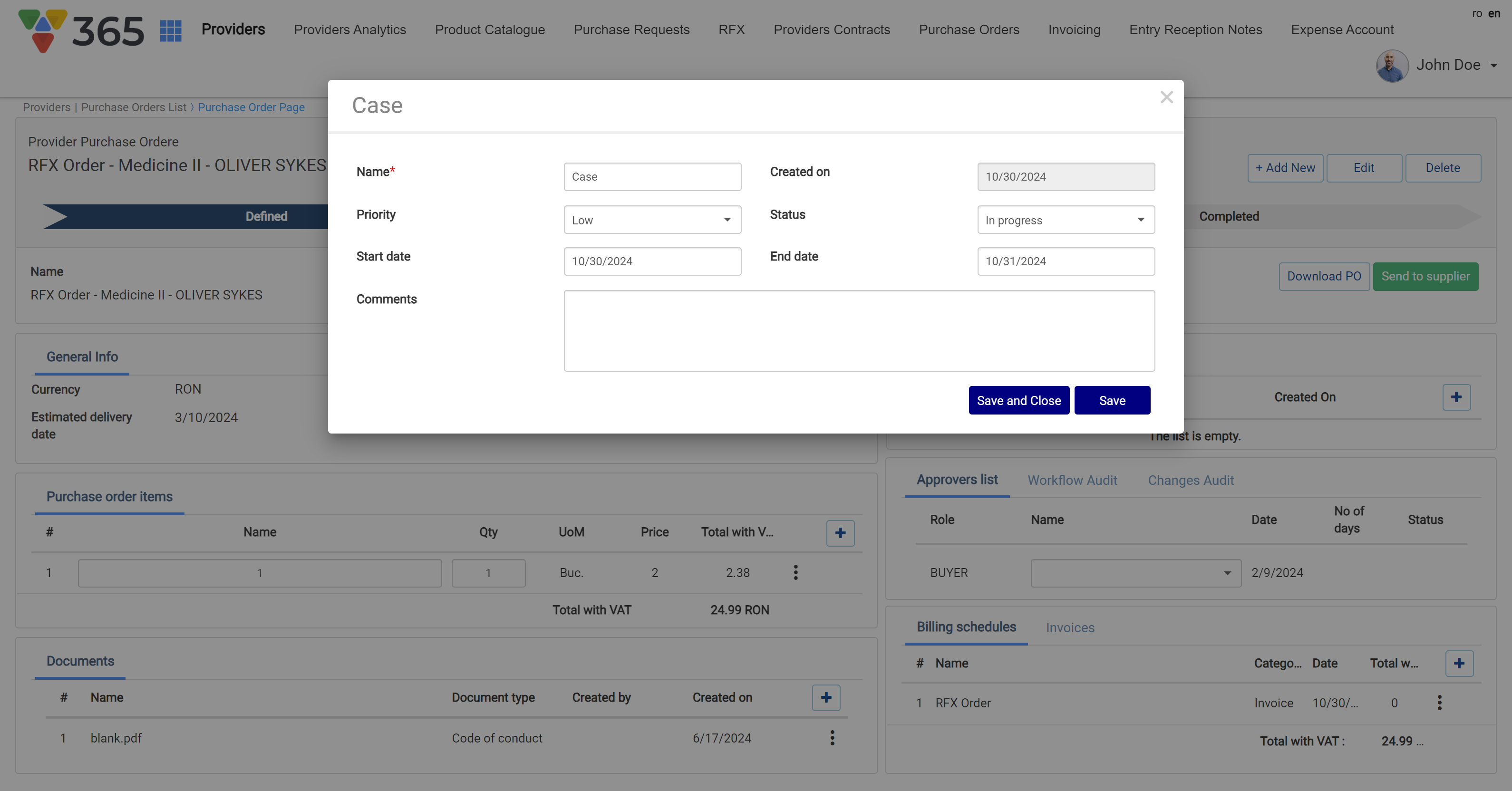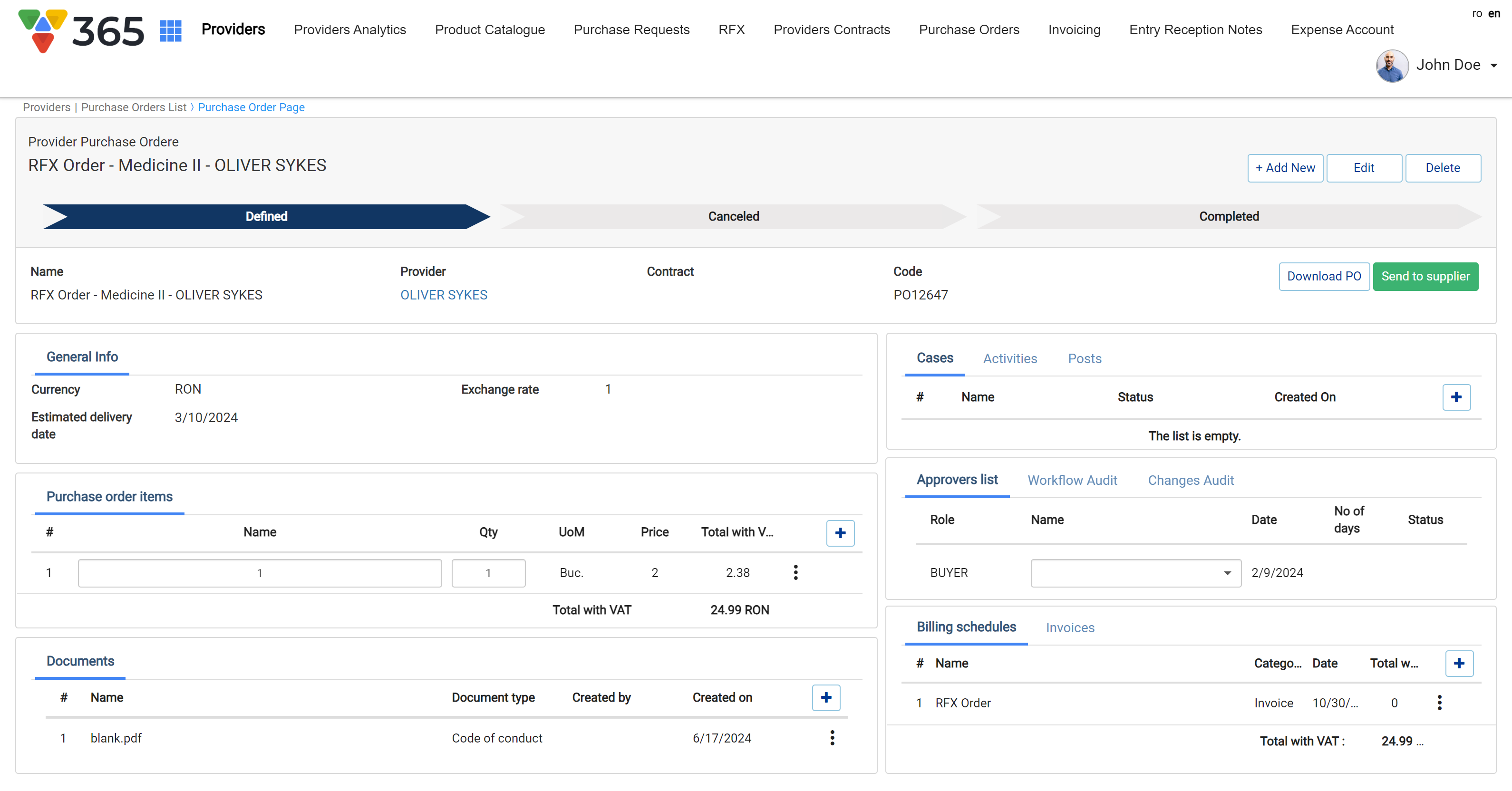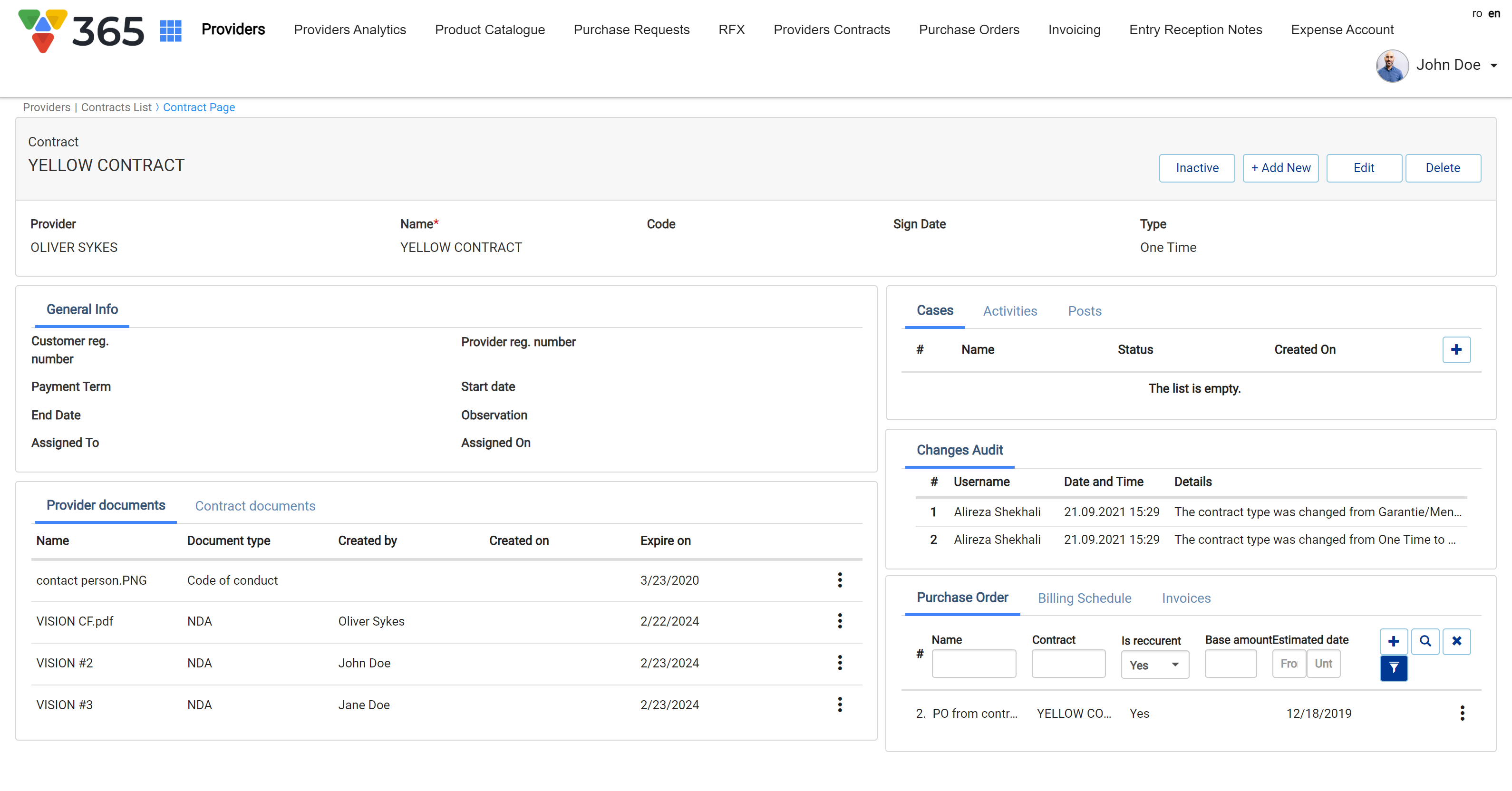 Controlling, coordinating, and streamlining all stages in the contract lifecycle. This module allows automated contract generation, terms approval and management of the related documents. Keep track of all contractual, legal and operational aspects of the purchasing process.